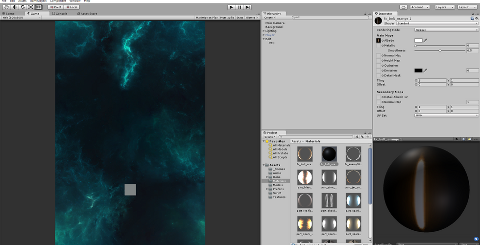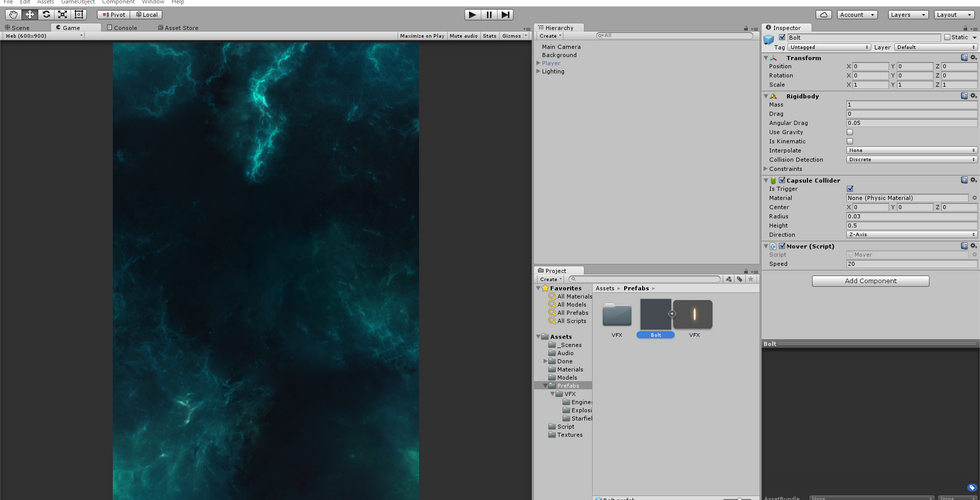 With the player set up, the next part would be creating shooting mechanic for the game. The first step to create the shooting mechanic is the bolt VFX component.